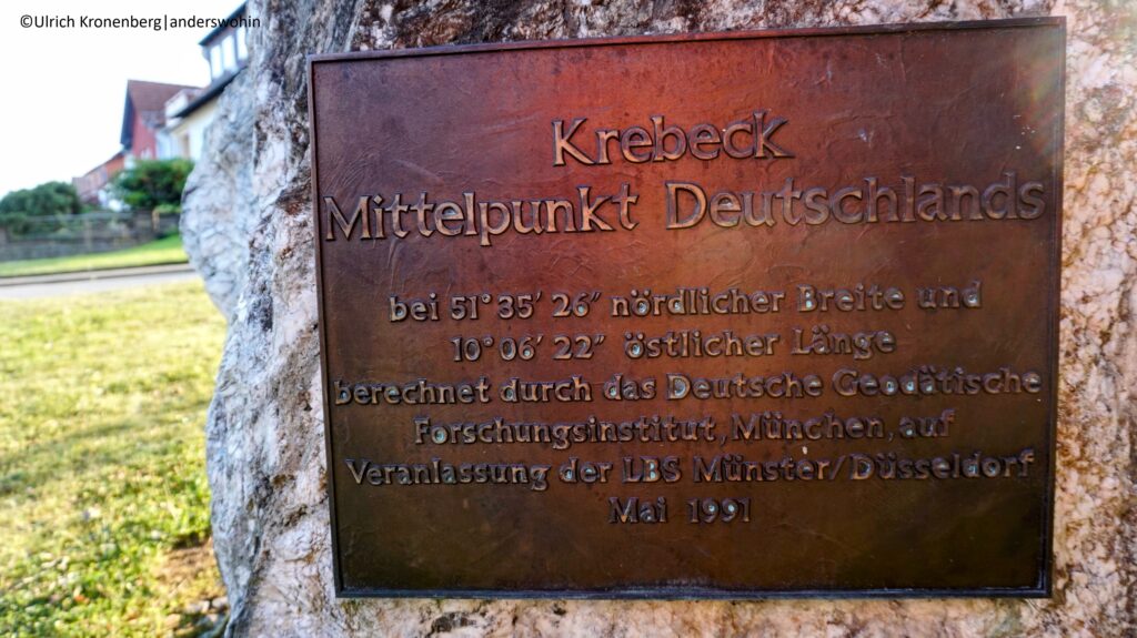 Das Deutsche Geodätische Forschungsinstitut gehört zur Technischen Universität München. 1991 gehörte es zur Bayerischen Akademie der Wissenschaften. Das Forschungsinstitut hat also festgestellt, dass in Krebeck der Mittelpunkt von Deutschland ist. Er ist nicht genau hier. Der Stein steht hier wohl eher aus touristischen Gründen. Der richtige Mittelpunkt liegt einen halben Kilometer von hier in einem Waldstück.