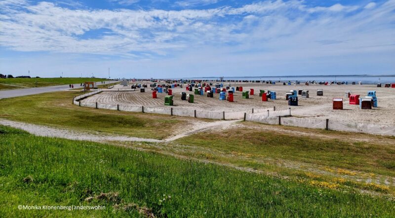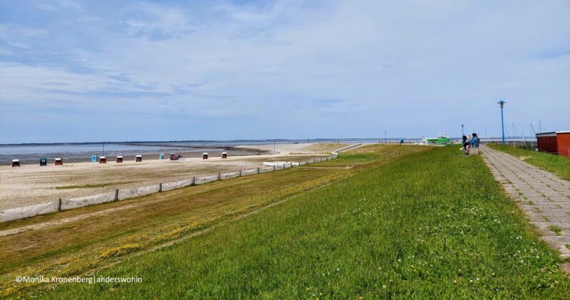 Wir steigen auf den Deich neben dem Hafenbecken. Dahinter liegt der Strand. Um 1966 wurde er angelegt. Auch auf dem Deich gibt es Bänke.